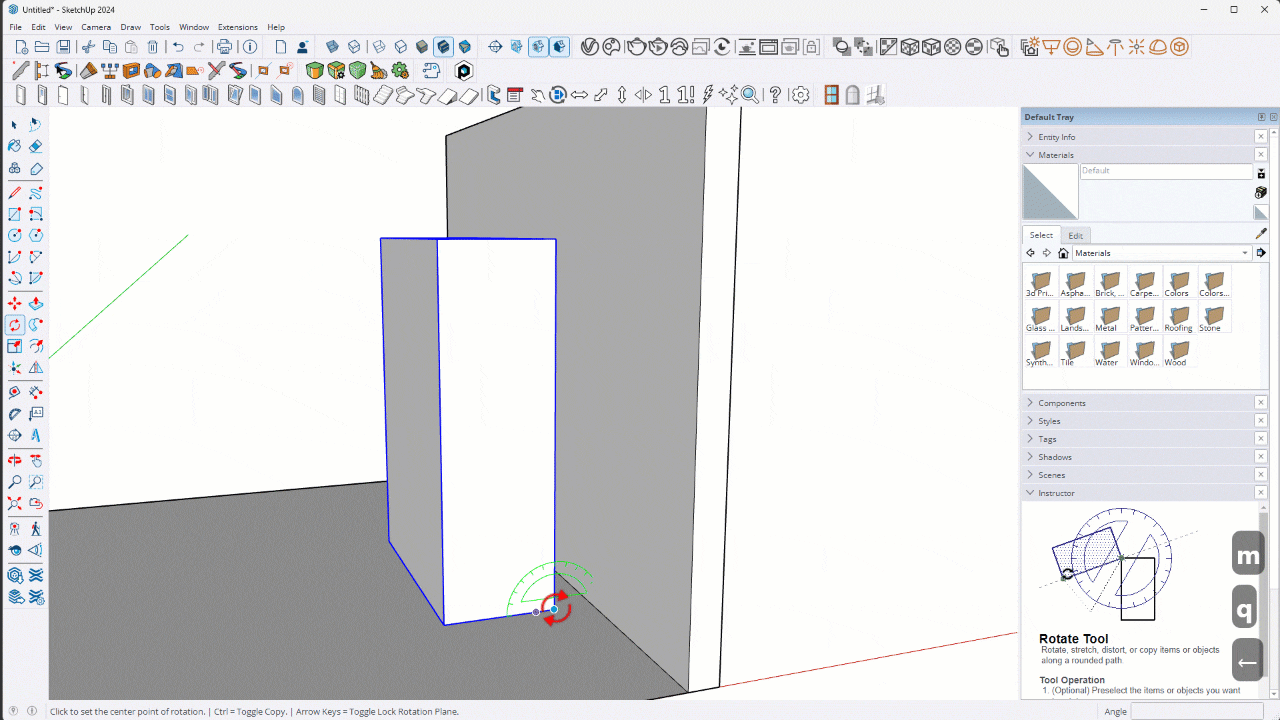 Just like when you lean a ladder up against a wall, this new functionality lets you know with an “X” when the geometry you’re rotating intersects the face you’re “leaning” into. This is a very helpful feature for instances where you have a floor length mirror and need to have it angled so that it’s bottom is on the floor and the top is resting against the wall at an angle. This exact task is covered inside my FOCUSED SketchUp + AI for Interior Design in the lesson “Adding Furniture and Décor”.
