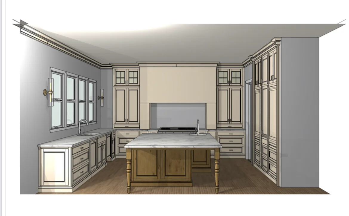 Now using SketchUp and V-Ray to create this kitchen, I had much more control over EVERYTHING and was able to incorporate all of the real finishes, fixtures, colors, and details. This is the render I provided to the client: