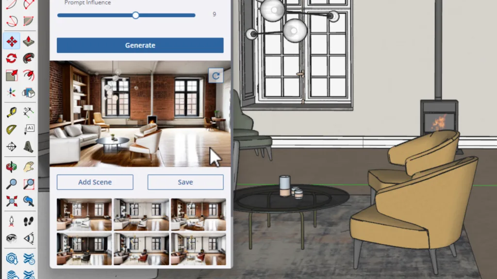 One of the issues with AI rendering is that it does not always accurately follow the prompts provided. As demonstrated in the previous section, even when specifying input in the text prompt such as “New York Loft” or “brick floor, white walls,” the results may not align with our expectations. This lack of accuracy can be frustrating, especially when trying to achieve a specific design concept. Prompt control is an important part of making AI in SketchUp a power tool that interior designers can use to take their designs to the next level.
