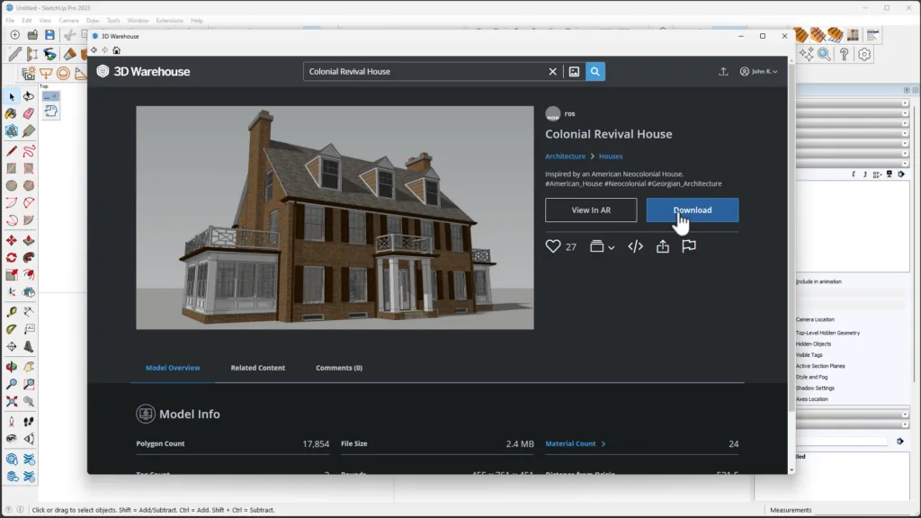 For this test, we will load a colonial revival house model from the 3D Warehouse. This model, created by “ror”, will serve as our base for generating AI renders of exterior scenes.