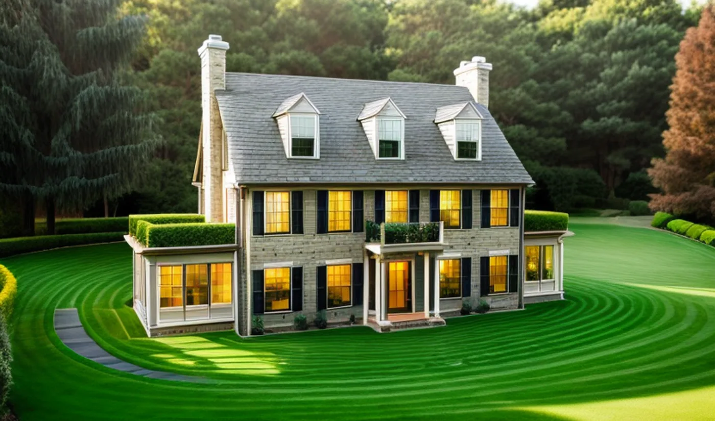 Using the prompt “structured gardens, circular driveway, green grass” with “No Style” selected produced the following three AI renders: