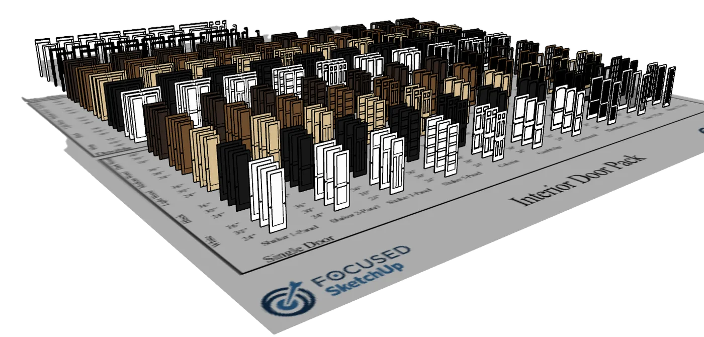 As you start to use the 3-D warehouse inside of SketchUp, you will quickly realize that you can spend way too much time searching for the object you need. It’s a terrible use of time, which is why I created “Packs” of objects that you can import into your projects and copy/move them into your space. Below is an example of one of the packs you get in the course – the Interior Door & Trim Pack. It contains 300 doors in 10 styles, and in 6 finishes:
