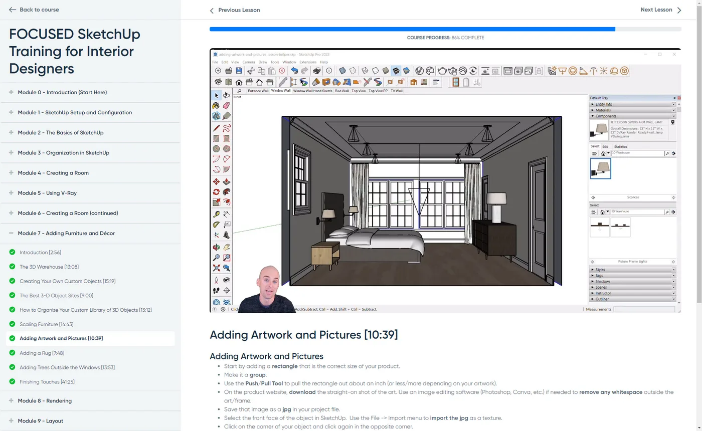 Some courses out there only focus on 3-D modeling in SketchUp, and don’t teach you how to make your models look like a photograph. In this day and age, clients expect to be able to visually see a rendering of their space as close to real-life as can be. Just showing a 3-D model is not enough – making it photorealistic is key to wow-ing your clients and elevating your design brand!